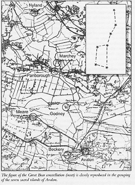The importance of Glastonbury's seven sacred islands is greatly expanded with the awareness that they are an ancient earthly mirror of the seven stars of the Great Bear or Big Dipper constellation (Ursa Major) This configuration is often called Arthur's Wain and traditional Astrological writers such as Rene Guenon, Philippe Lavenu and Julius Evola point out that in the ancient mythos, Arthur is the Bear (incidentally, MacArthur means 'Son of the Bear'). Without going into a detailed explanation if Arthur is the Bear/Warrior, then by natural correspondence Merlin is the Boar/Druid.